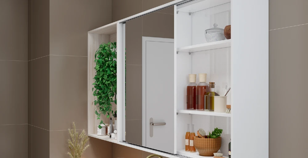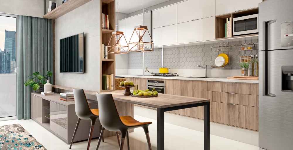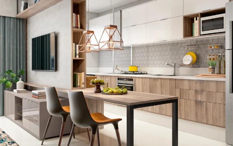 É importante a escolha de um mobiliário funcional, que ajude a manter a organização do ambiente, bem como um que tenha boa distribuição e não atrapalhe a circulação dos moradores. Armários aéreos e nichos cumprem os dois papéis! Além disso, são tendência na decoração.