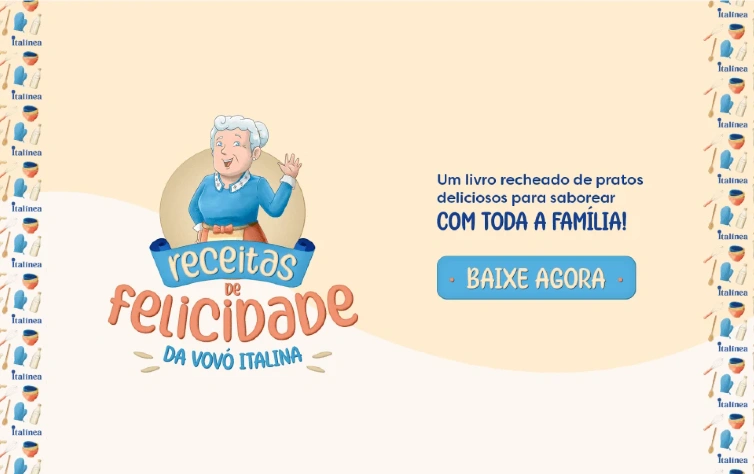 Todo chef tem um ingrediente especial para tornar as receitas mais saborosas e inesquecíveis; a Italínea também!Mas neste caso foi uma pessoa muito especial, a Vovó Italina. Mulher com talento incrível para a gastronomia, ela era avó dos fundadores da Italínea, que viram na matriarca a fonte de inspiração para a criação da empresa.Foi com base nesta bela história que nasceu o Livro de Receitas de Felicidade da Vovó Italina. Uma maneira de homenagear o legado de sabor deixado pela avó e ainda presentear os clientes da Italínea. GOSTOU DA IDEIA?